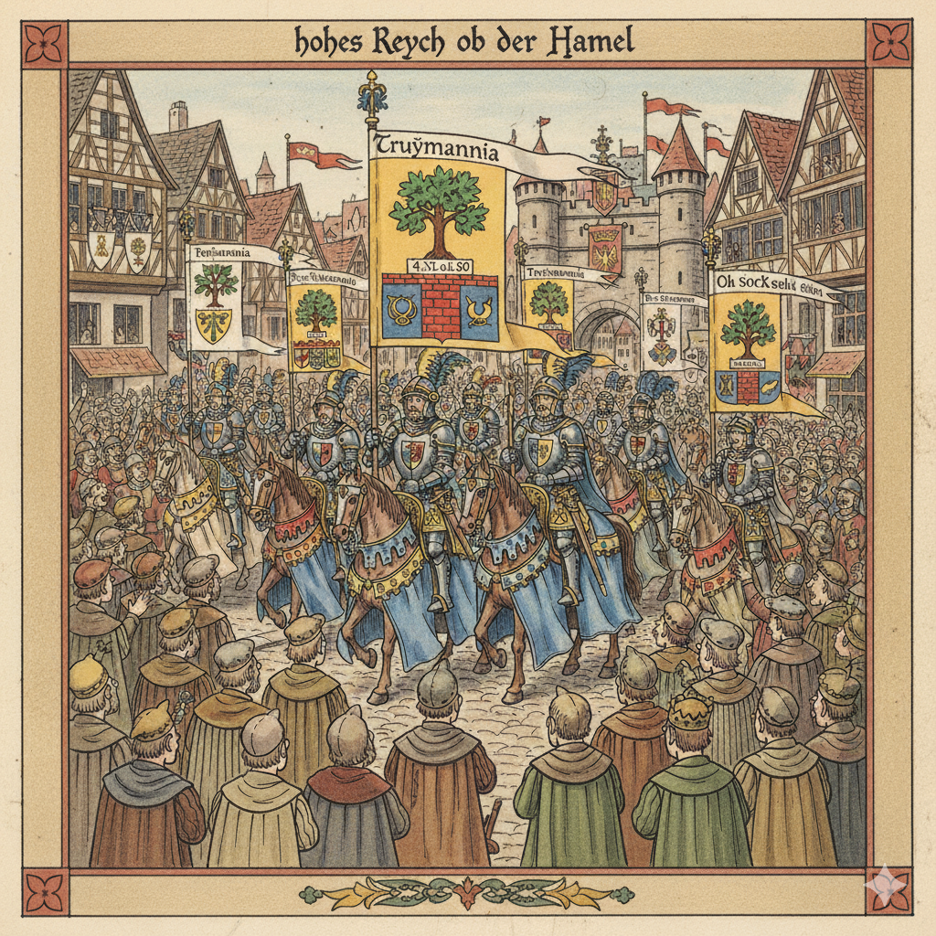 02apr20:002.103 Schlaraffiade *, Reychseinritt d, h. R. Truymannia (177)Sippung:Das Reych trägt zu allen Sippungen volle Rüstung * Bandelier ** Dunkles Gewams *** Festgewams