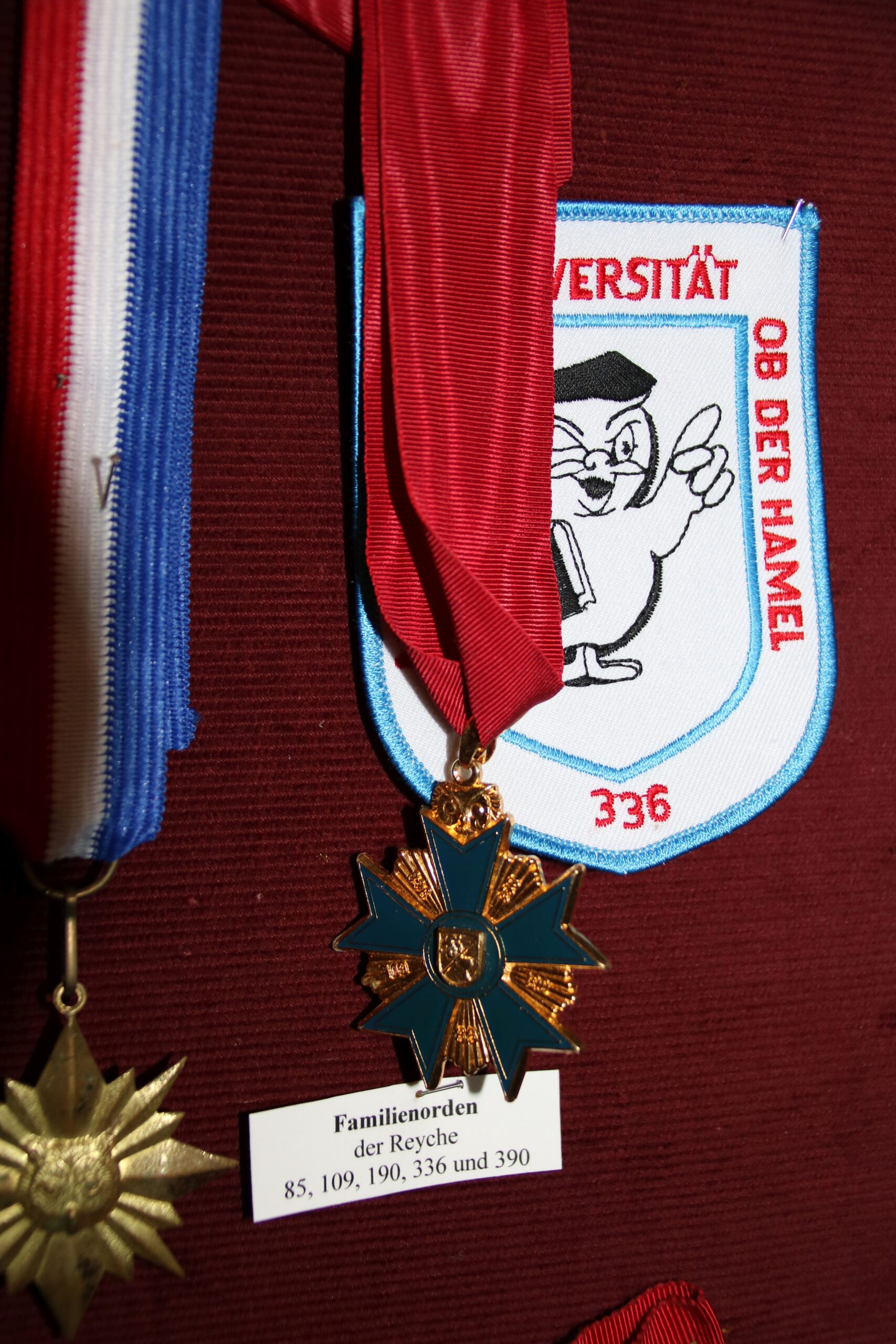 | Familiensippung | Nach dem endgültigen Verbot der Schlaraffia im Jahr 1937 sahen Schlaraffen nach 1945 die Möglichkeit, unseren Bund wieder zu neuem Leben zu erwecken. Das gelang in den Zonen der westlichen Alliierten sehr bald. Anders sah es in der sowjetischen Zone und der späteren DDR aus. Dort konnten sich Schlaraffen nur heimlich treffen. Zum Zeitpunkt der politischen Wende 1989 bestanden in der DDR noch acht aktive Schlaraffenreyche. Darunter waren die zu unserer Genealogie gehörenden Reyche Erforda (Erfurt) und Vimaria (Weimar). Trotz der widrigen Umstände hatten Mitglieder der Schlaraffia Ob der Hamel seit vielen Jahren enge Kontakte zu beiden Reychen unterhalten. Auf Grund einer Initiative von Ob der Hamel treffen sich die verbliebenen fünf Reyche unserer Genalogie (Vimaria, Erforda, Hildesia, Ob der Hamel und Kaiserpfalz) seit der Winterung 143/144 regelmäßig im Lenzmond zu einer Familiensippung. Als äußeres Zeichen der Verbundenheit wurde ein Familienorden geschaffen. |